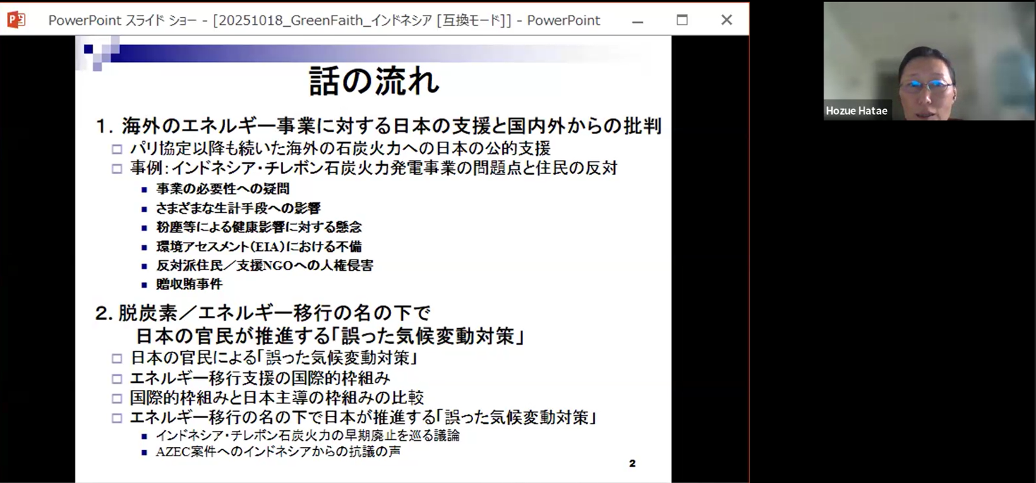 波多江さんは現在フィリピンを拠点に、南アジアで進む石炭燃料事業に関する住民被害の調査・支援を続けておられます。今回は、インドネシアのチレボン石炭火力発電所で実際に起きている事実をもとに、日本の官民が関与する国際エネルギー支援の構造的な問題についてお話しいただきました。