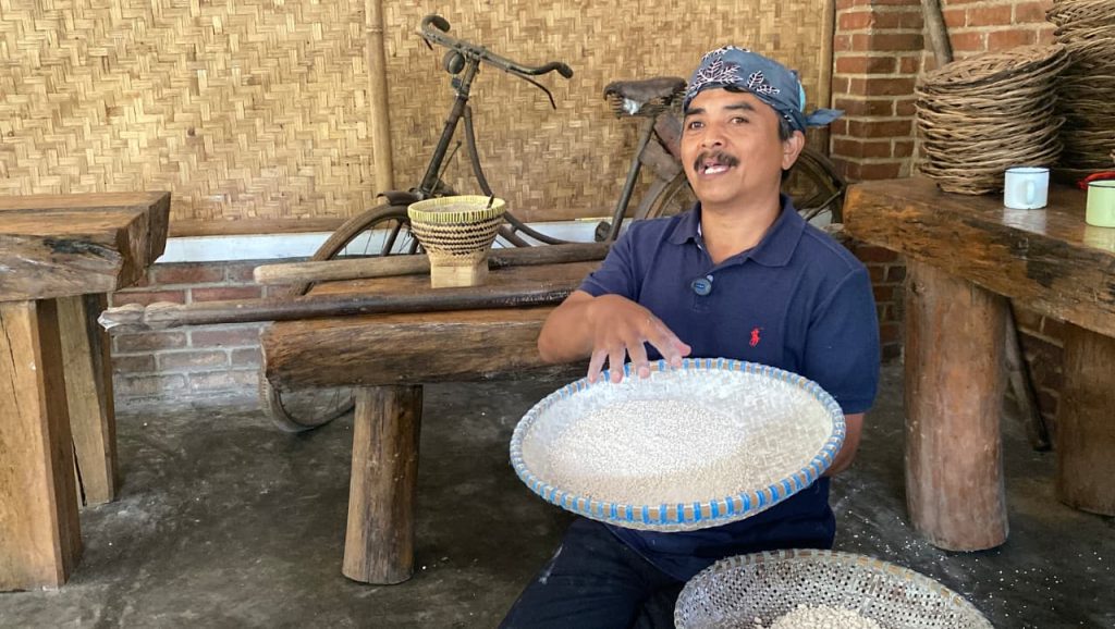 Mang Jajat shows dried and pounded cassava pulp, ready to be cooked like rice. This food, known as rasi or cassava rice, is a traditional staple of Kampung Adat Cirendeu, West Java. (Photo by: Fajar Firmansyah / GreenFaith Indonesia)