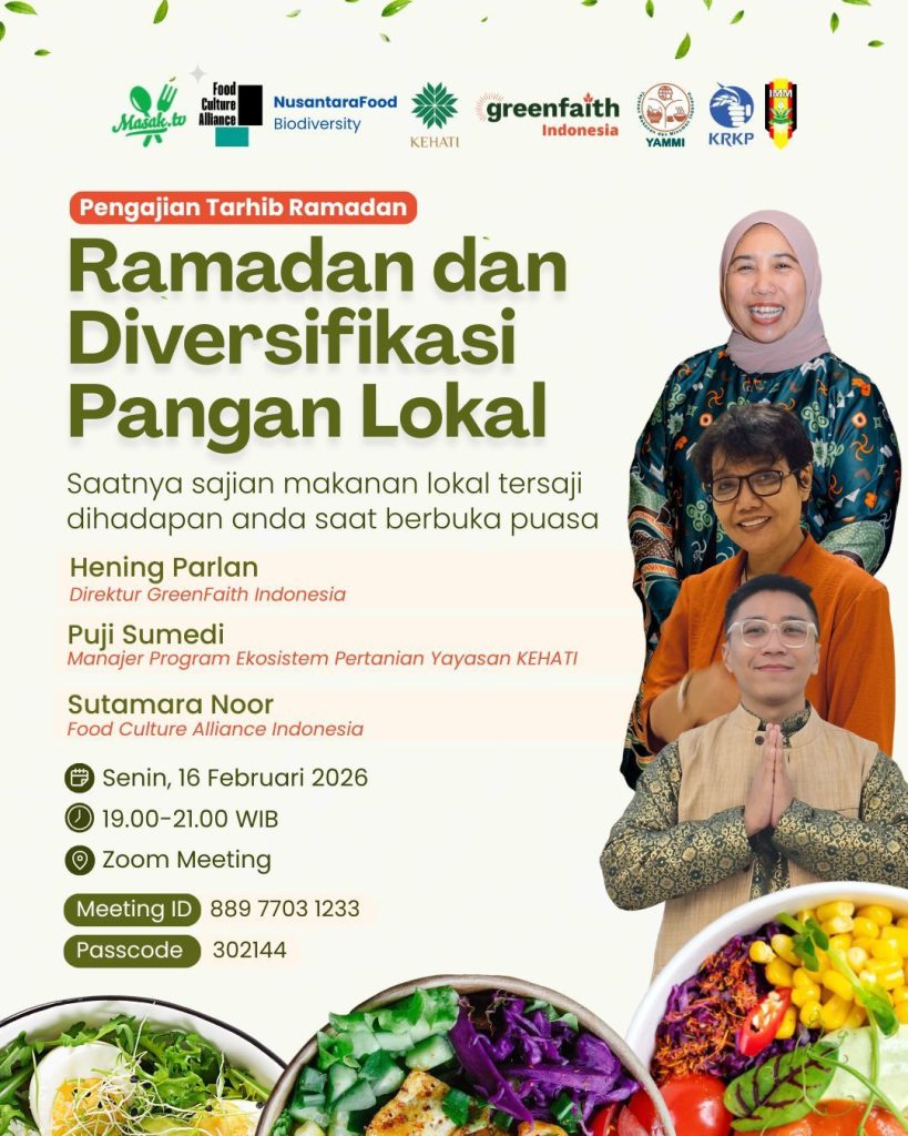 Ajakan ini mengemuka dalam Pengajian Tahrib Ramadan bertema “Ramadan dan Diversifikasi Pangan Lokal” yang diselenggarakan melalui kolaborasi antara GreenFaith Indonesia, Yayasan KEHATI, Food Culture Alliance Indonesia (Aliansi Budaya Pangan), dan Dewan Pimpinan Pusat Ikatan Mahasiswa Muhammadiyah (DPP IMM), serta diikuti oleh 42 peserta pada Senin 16 Februari 2026.