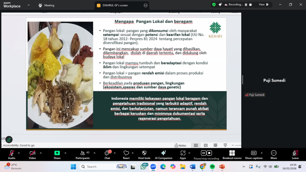 Tangkapan layar: Puji Sumedi, Manager Program Ekosistem Pertanian Yayasan KEHATI, menjelaskan bahwa pangan lokal mampu tumbuh dan beradaptasi dengan kondisi iklim dan lingkungan setempat, serta rendah emisi dalam proses produksi dan distribusinya, pada acara Pengajian Tahrib Ramadan, Senin (16/2).