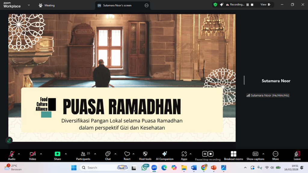 Tangkapan layar: GreenFaith Indonesia melaksanakan Pengajian Tahrib Ramadan pada Senin (16/2) bertema “Ramadan dan Diversifikasi Pangan Lokal” bersama Yayasan KEHATI, Food Culture Alliance Indonesia, dan DPP Ikatan Mahasiswa Muhammadiyah untuk mendorong kehadiran pangan lokal di meja sahur dan berbuka sebagai wujud praktik iman yang adil bagi bumi.